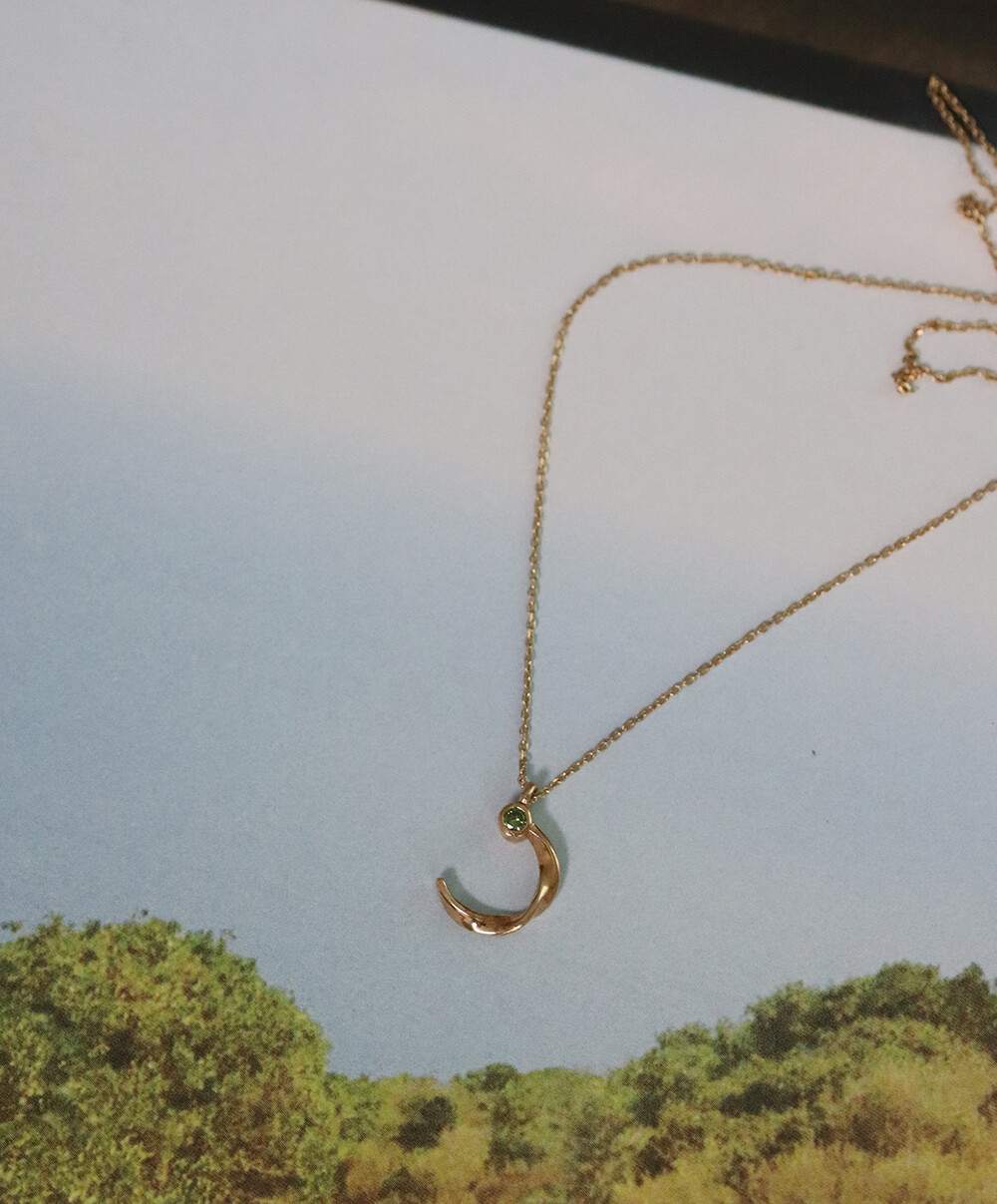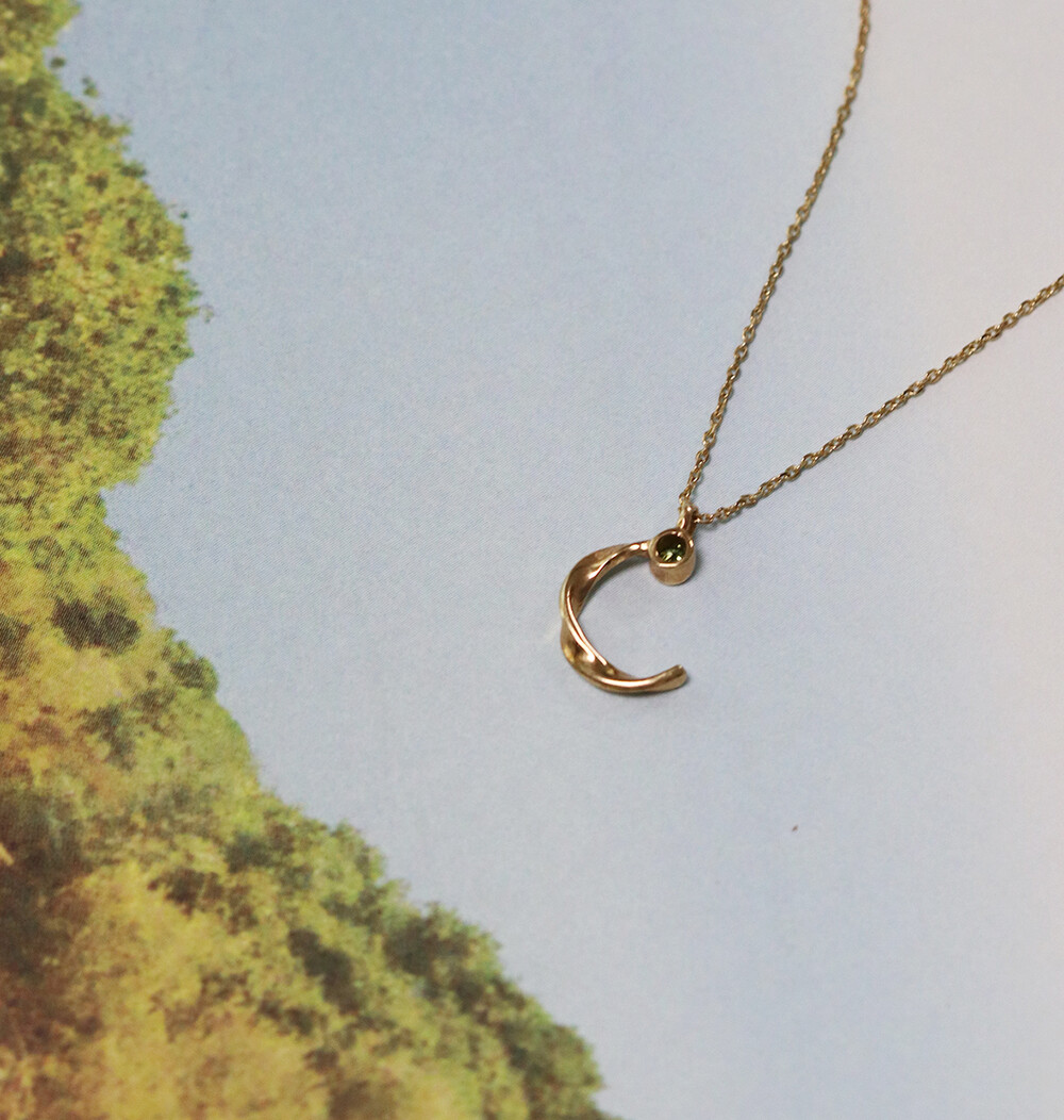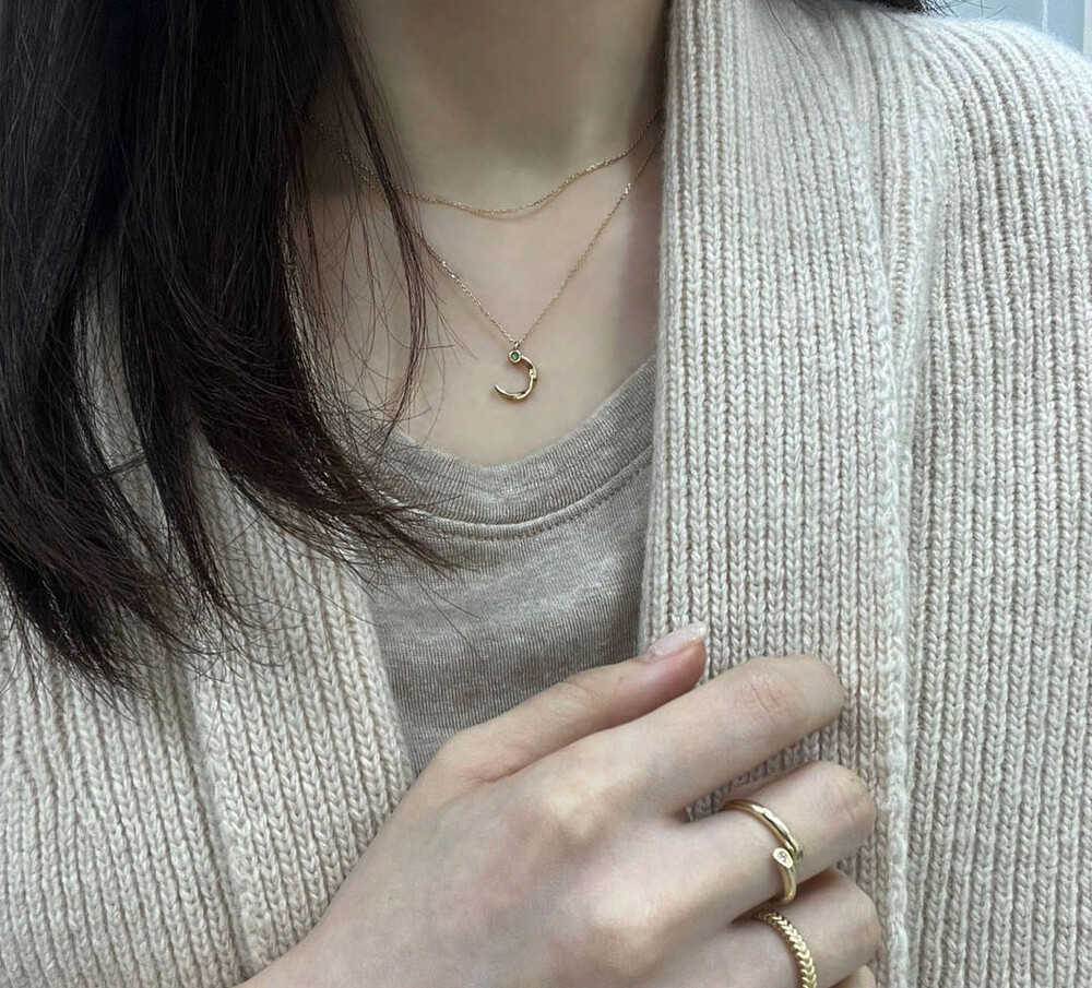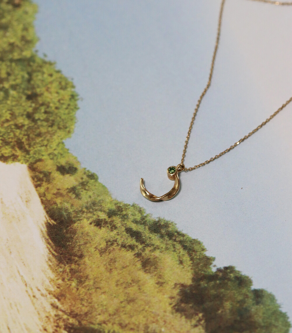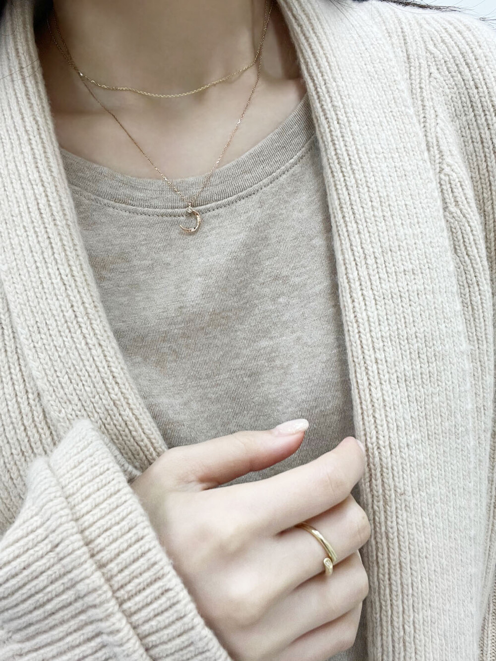 반달 형태의 꼬임 디테일과 다이아몬드가 조화롭게 어우러진 펜던트가 귀여우면서 여성스러운 분위기의 무드를 가진 목걸이입니다.
