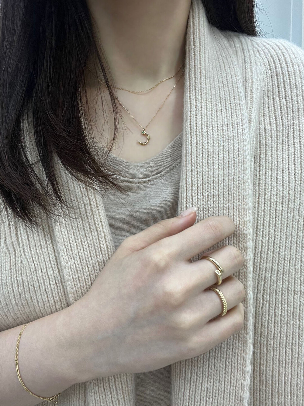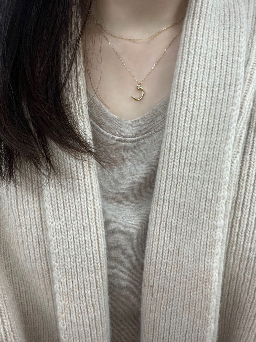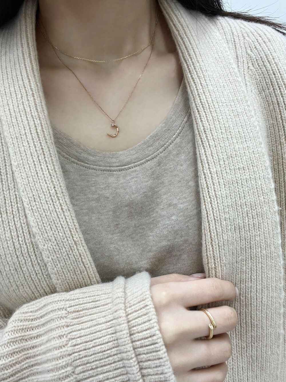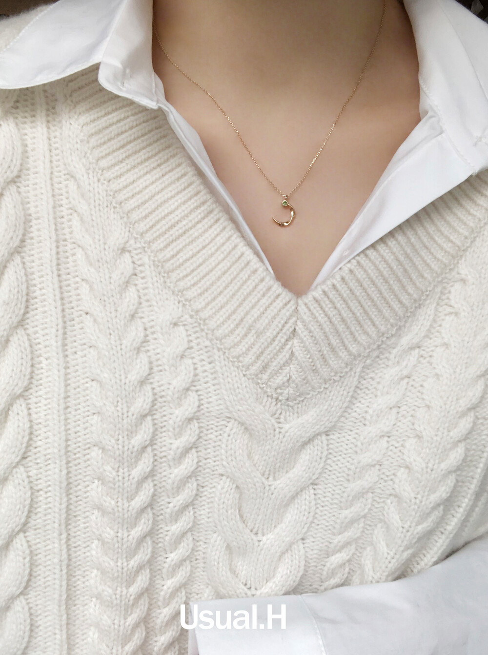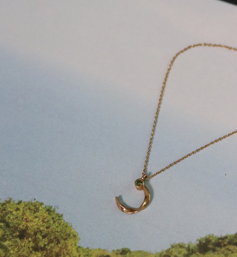 반달 형태의 꼬임 디테일과 다이아몬드가 조화롭게 어우러진 펜던트가 귀여우면서 여성스러운 분위기의 무드를 가진 목걸이입니다.