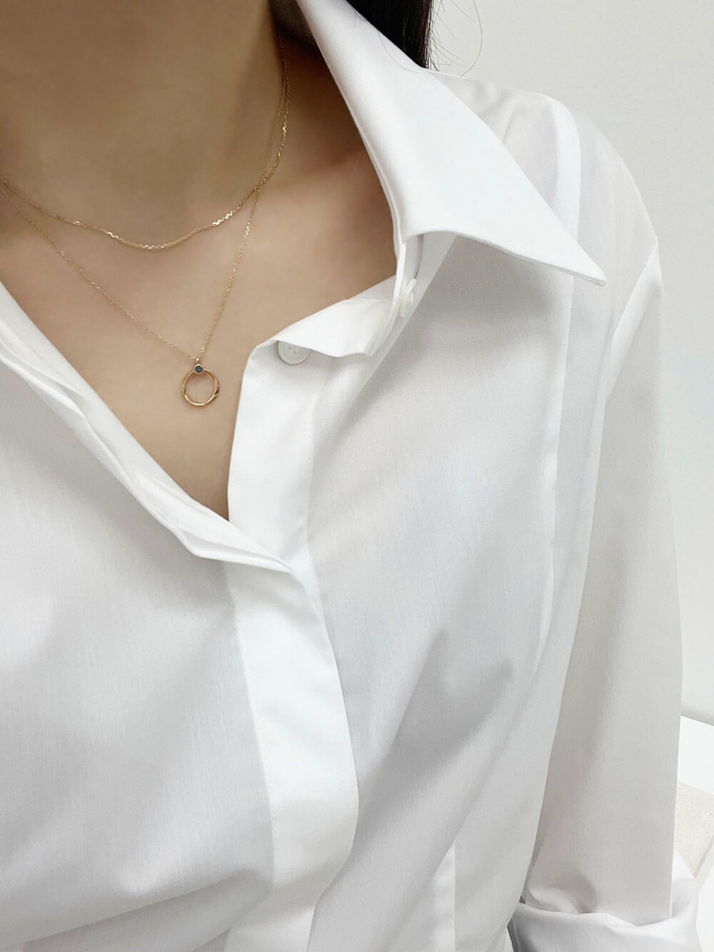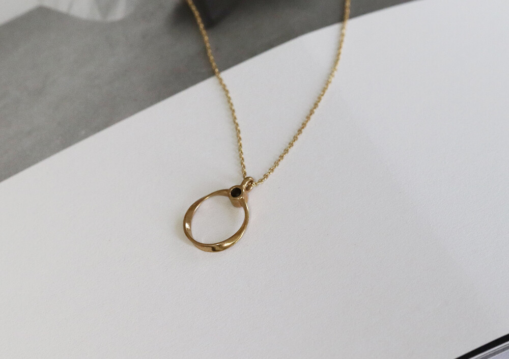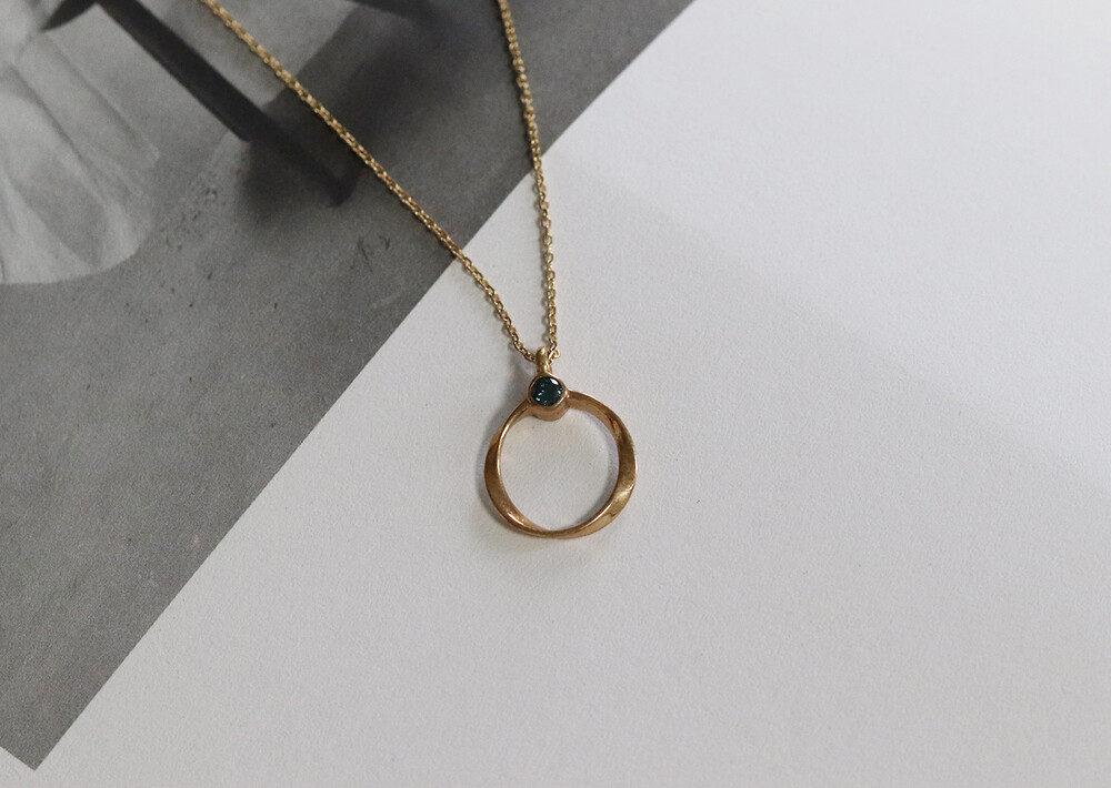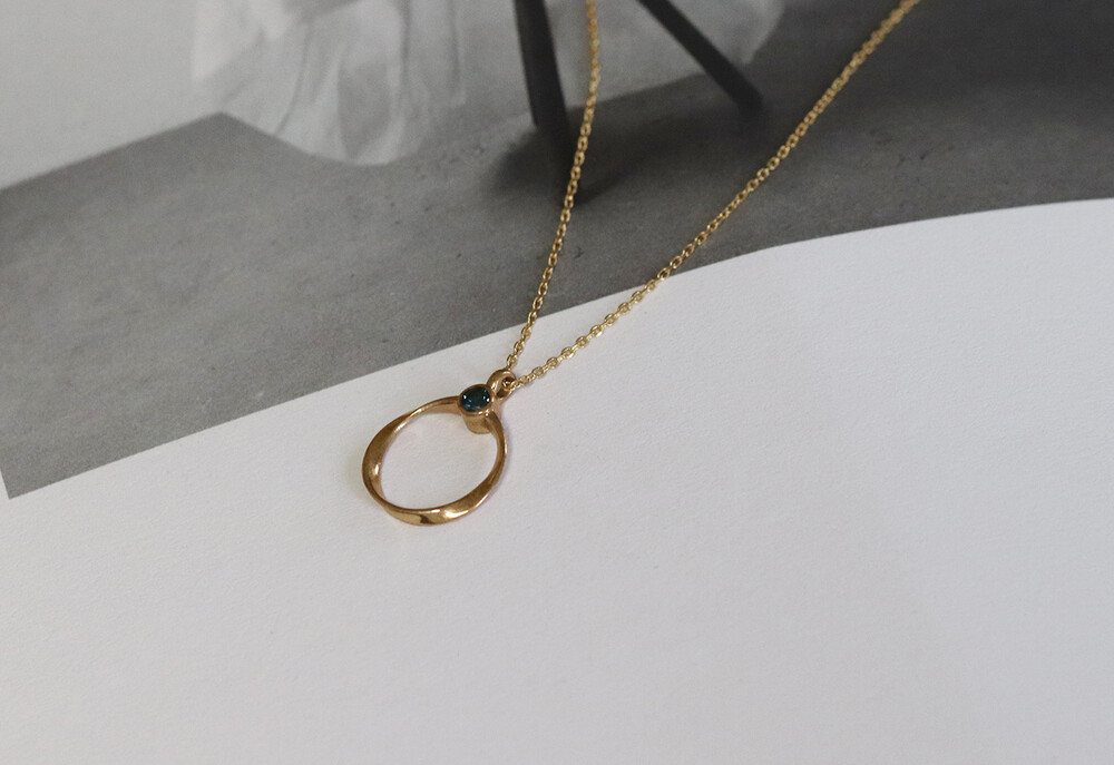 원에 꼬임을 준 형태와 베즐 세팅 된 블루다이아몬드가 포인트가 된 목걸이입니다.